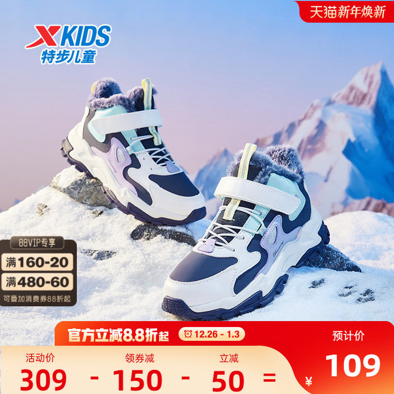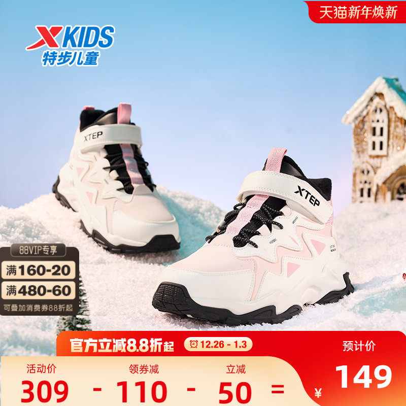 特步儿童冬季新款中大童鞋女童冬鞋二棉鞋加绒棉鞋儿童高帮休闲鞋
