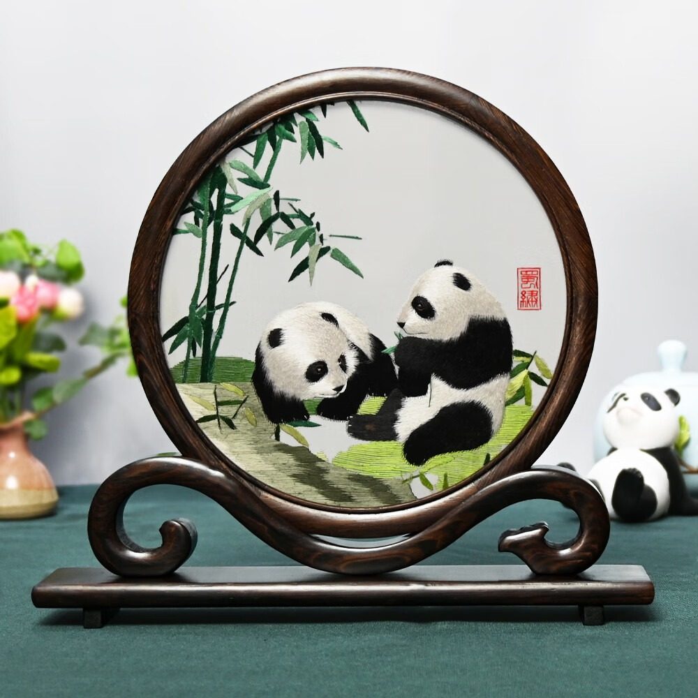 蜀绣熊猫手工双面绣刺绣摆台四川特色礼物送老外出国礼品伴手礼物