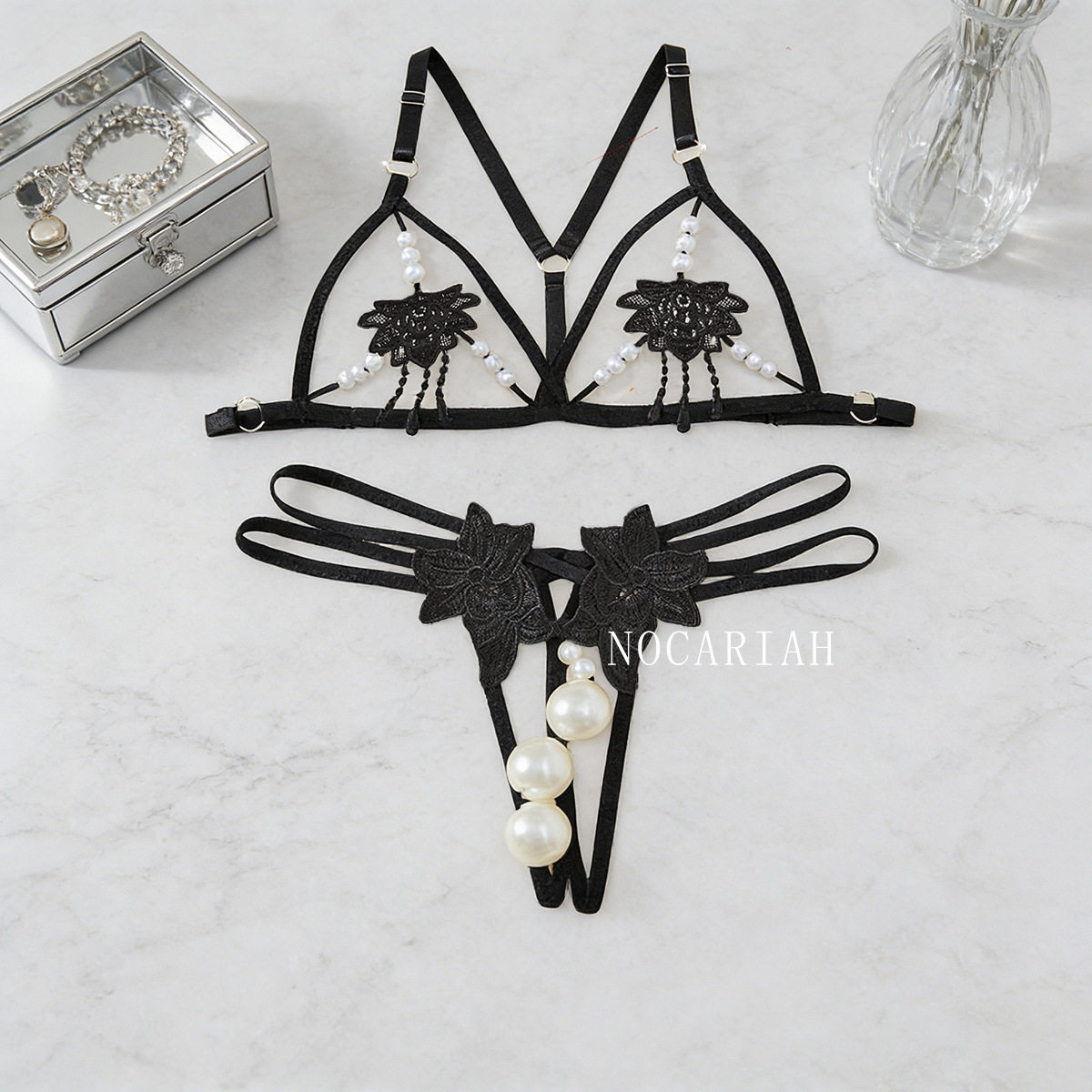 女士内裤情侣款激情丁字裤刺绣一根绳t字大珍珠内裤性感火爆蕾丝