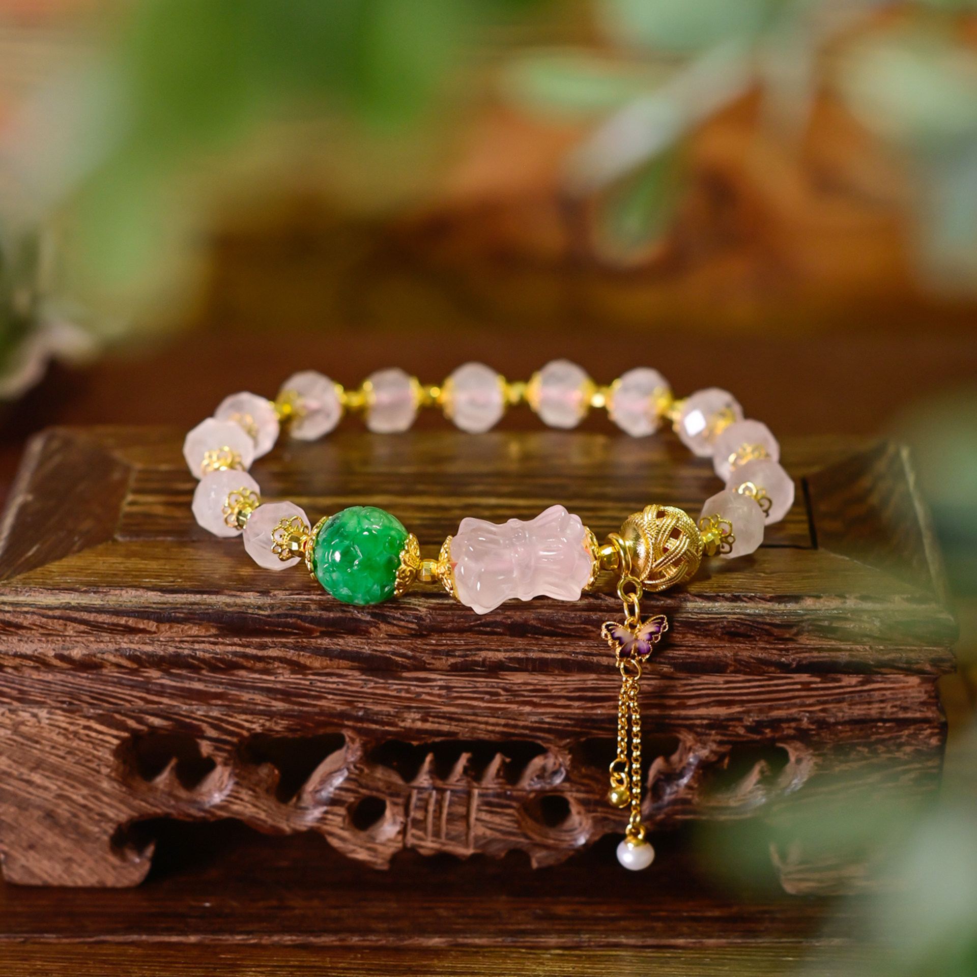 PIPISHOP 天然A货翡翠雕花路路通925银镀金配饰粉水晶单圈手串
