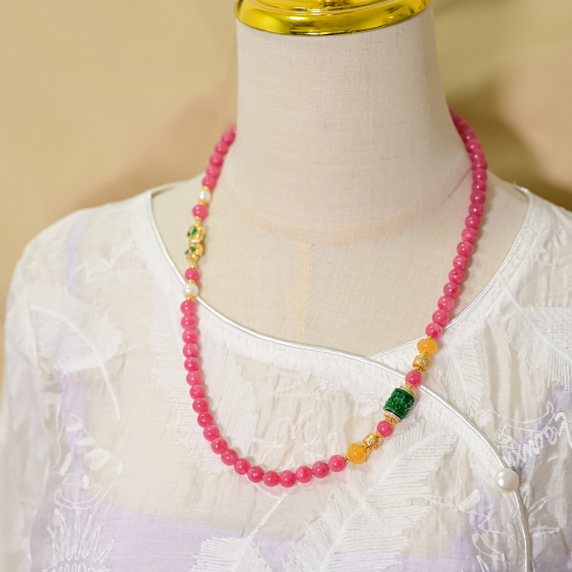PIPISHOP 天然A货干青翡翠路路通蜜蜡算盘珠蔷薇石圆珠长项链