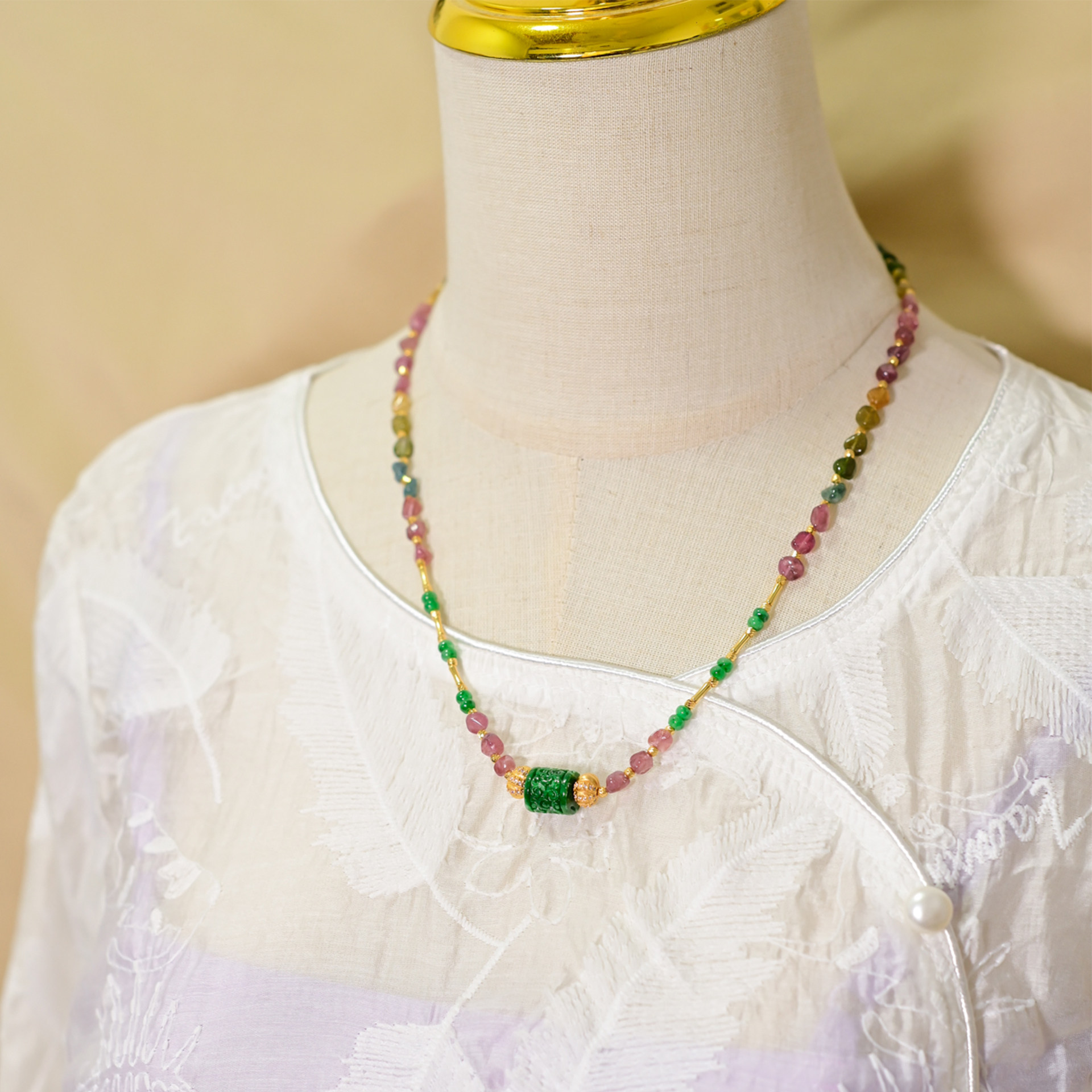 PIPISHOP 天然A货干青翡翠路路通925银镀金碧玺随形原石短项链