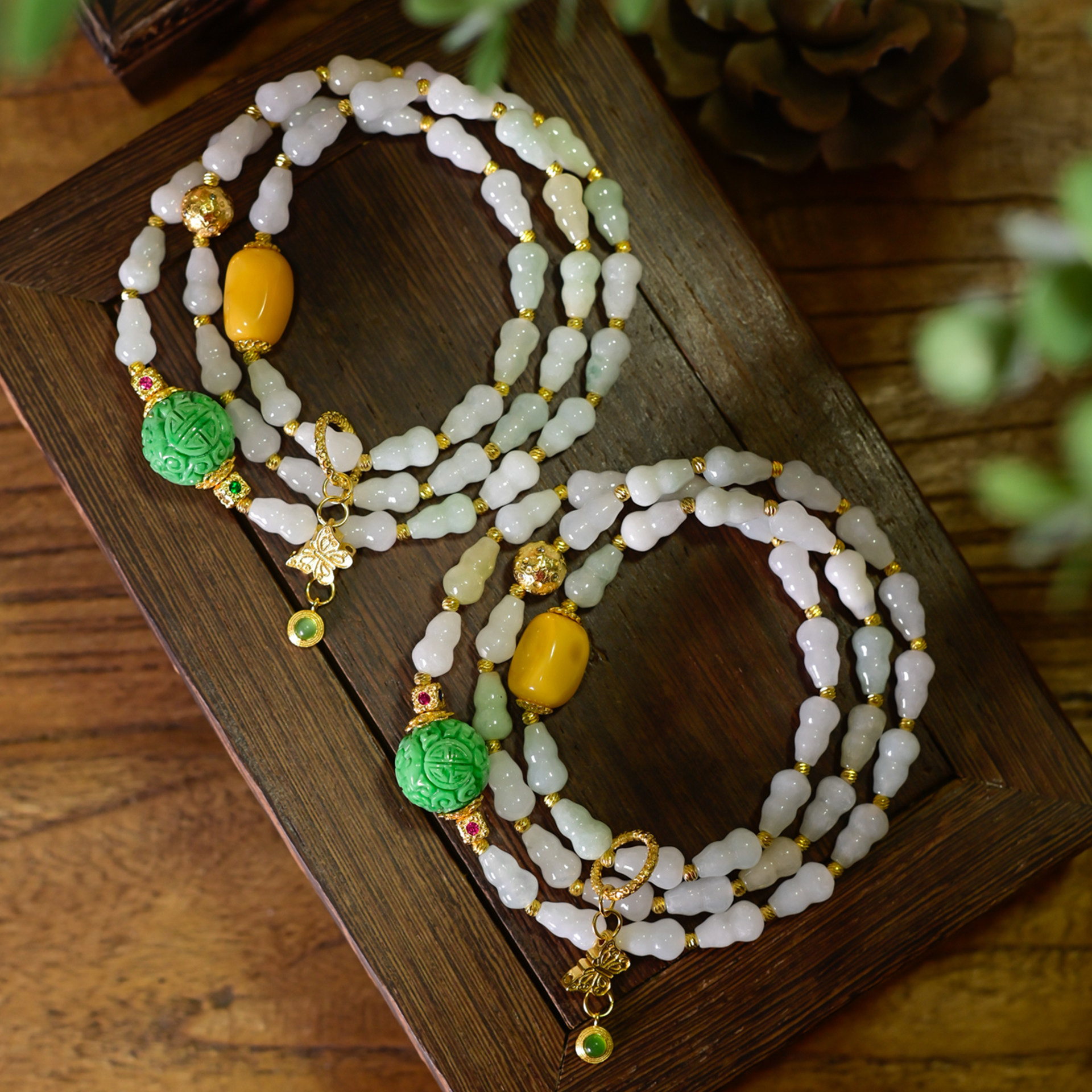 PIPISHOP 天然A货干青翡翠雕花圆珠随形蜜蜡翡翠葫芦三圈手串