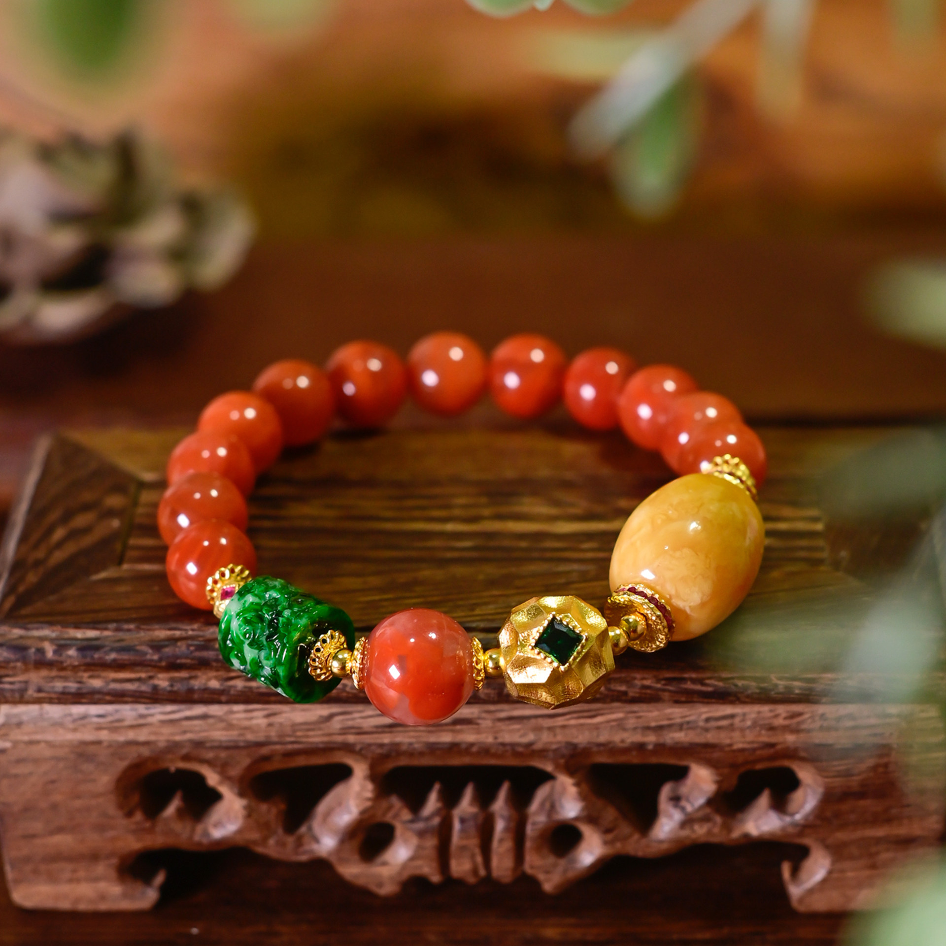 PIPISHOP 天然A货翡翠雕花路路通蜜蜡枣珠南红玛瑙单圈手串