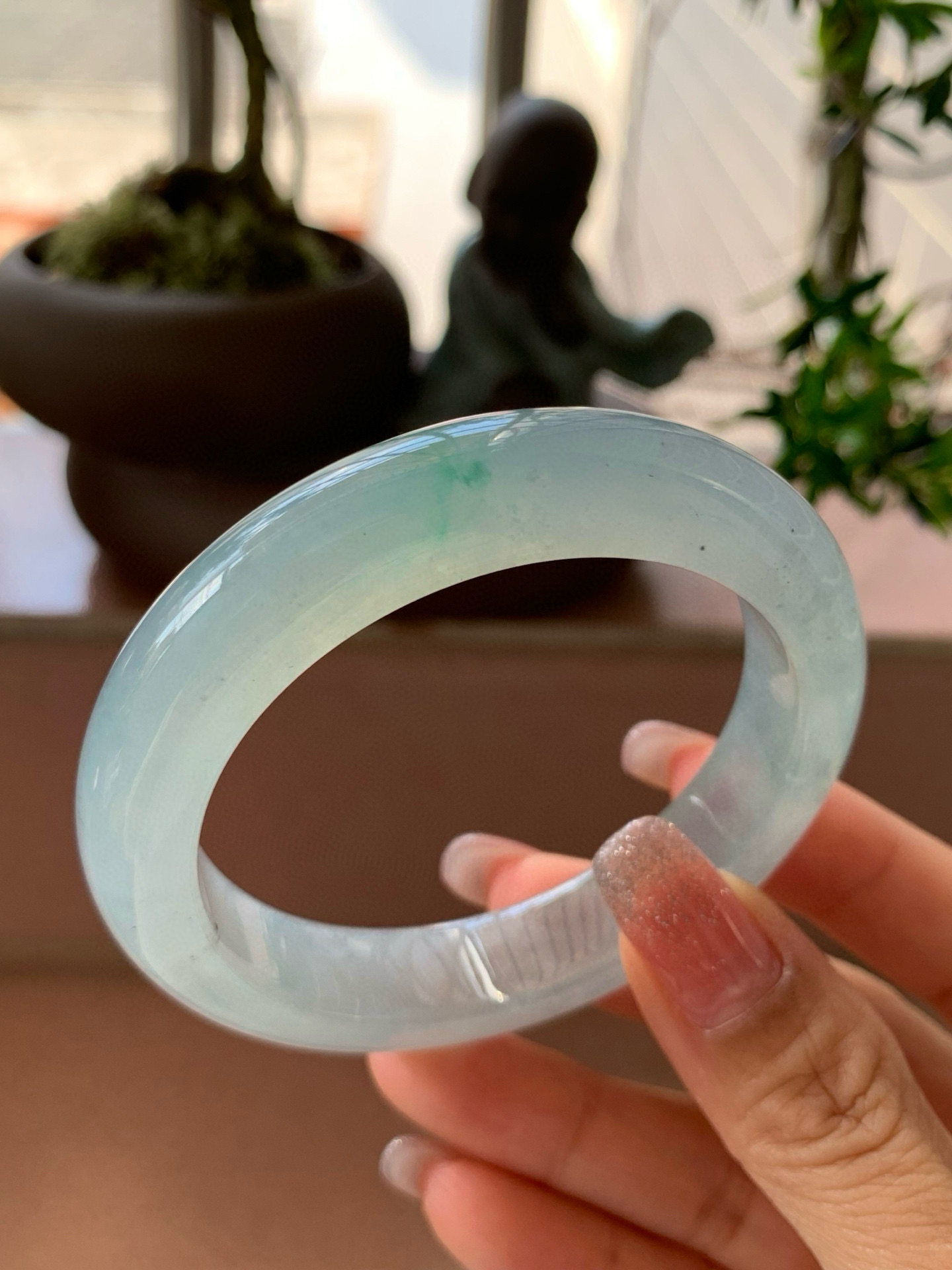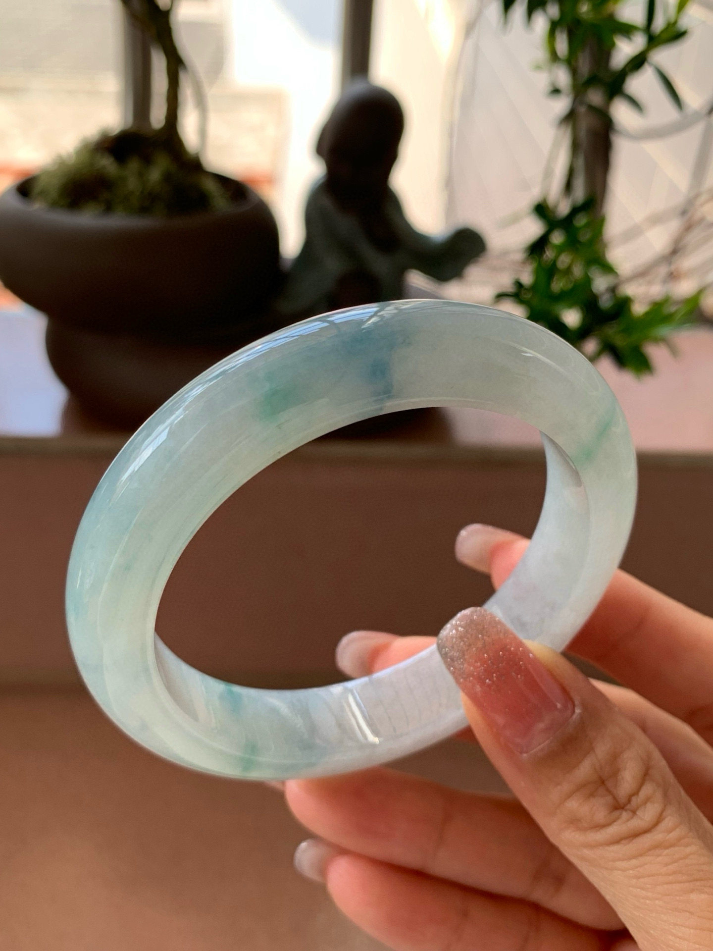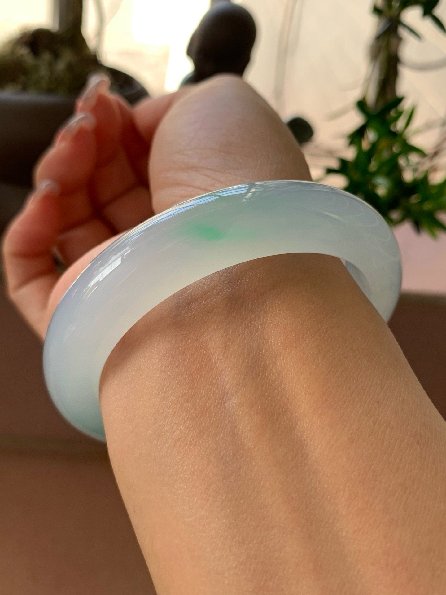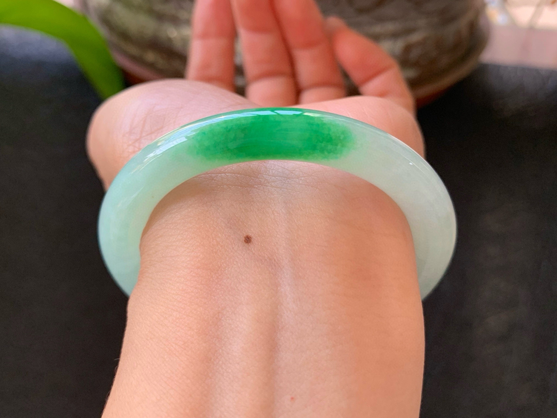 【小陈翡翠】缅甸天然翡翠A货冰湖水绿飘一抹色花56-57正圈手镯