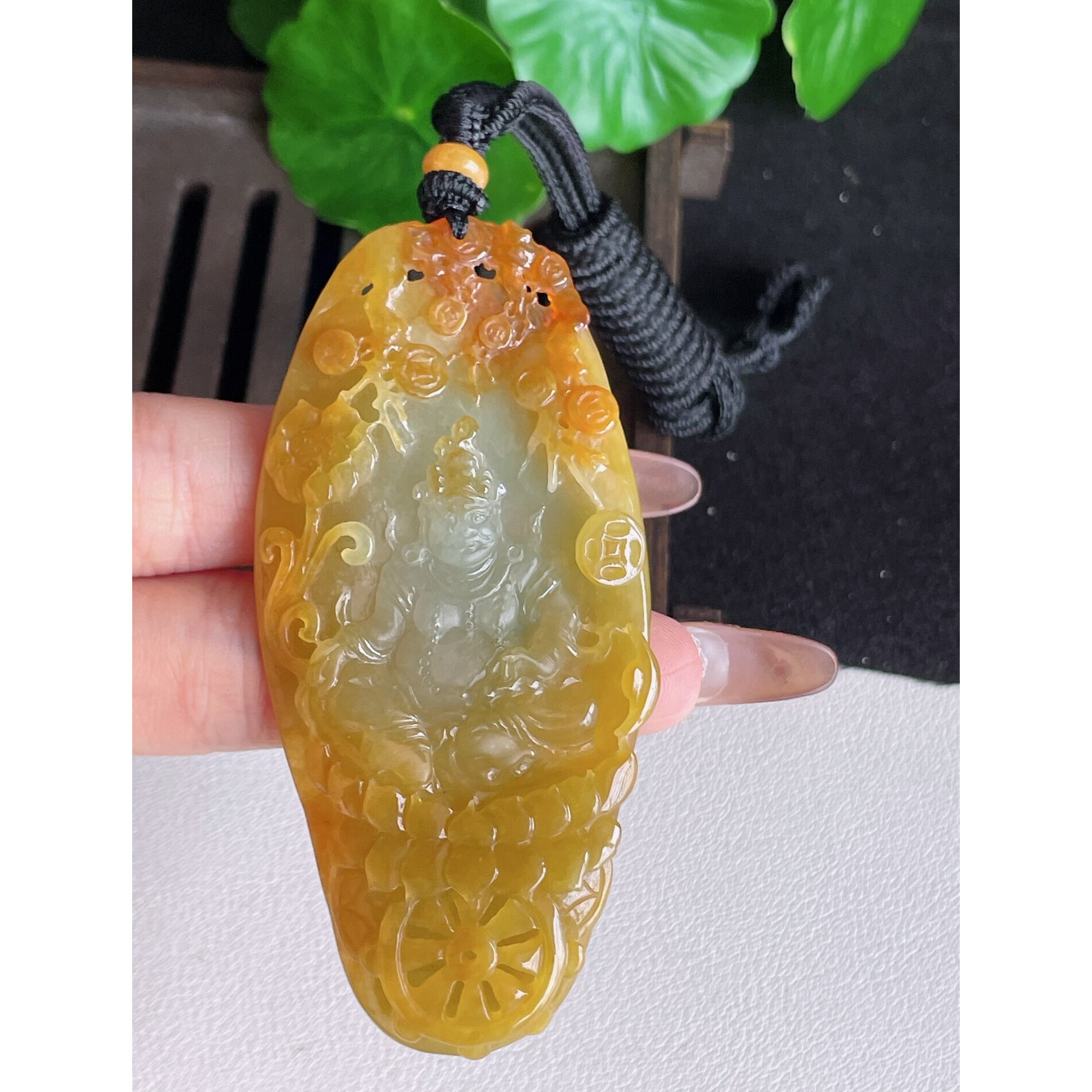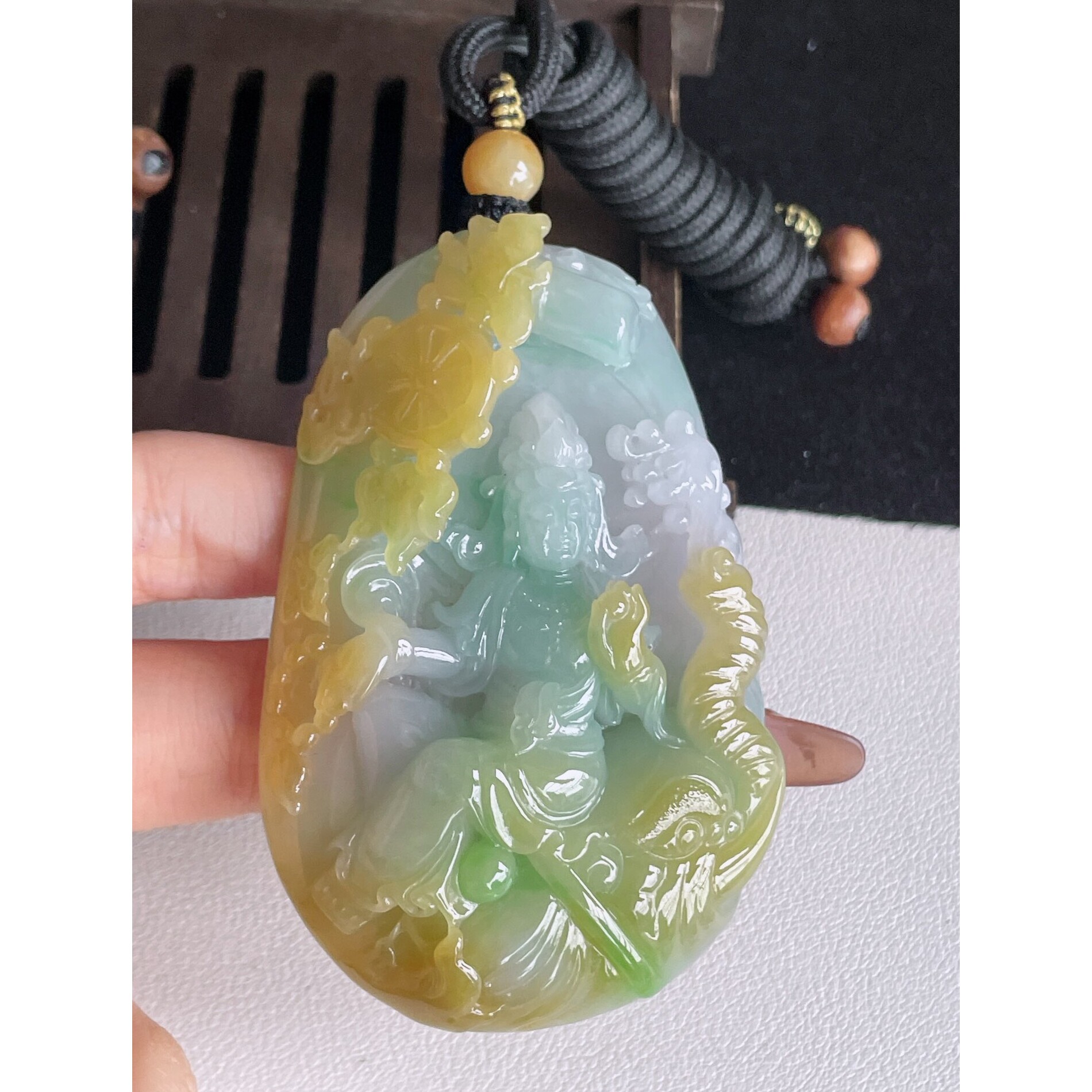 一手货源缅甸天然A货翡翠玉挂件精雕双彩黄加绿普贤菩萨翡翠吊坠