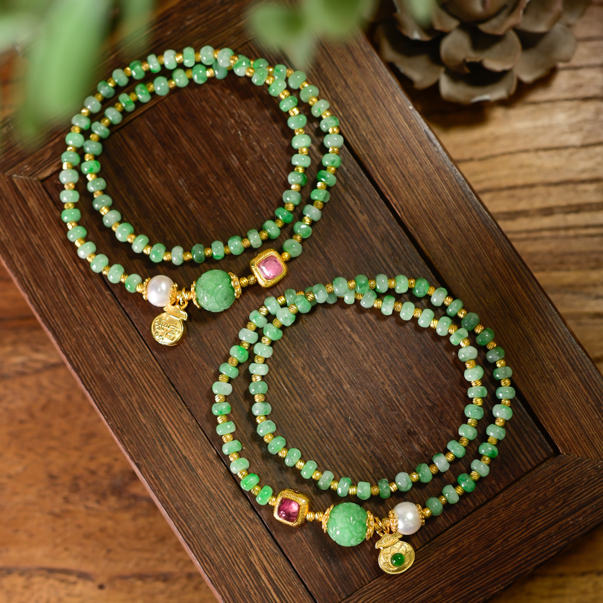 PIPISHOP 925银镀金钱袋小吊坠天然A货翡翠绣球算盘珠双圈手串