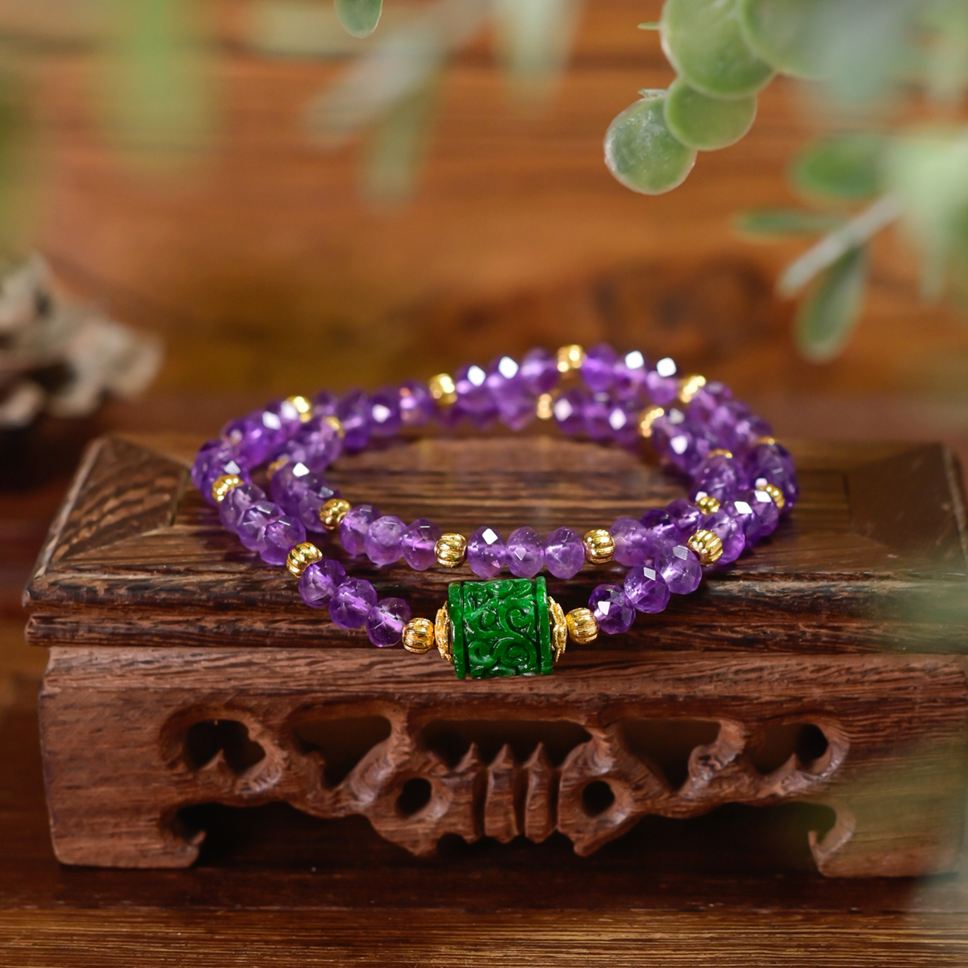 PIPISHOP 天然A货干青翡翠路路通925银镀金切面紫水晶双圈手串