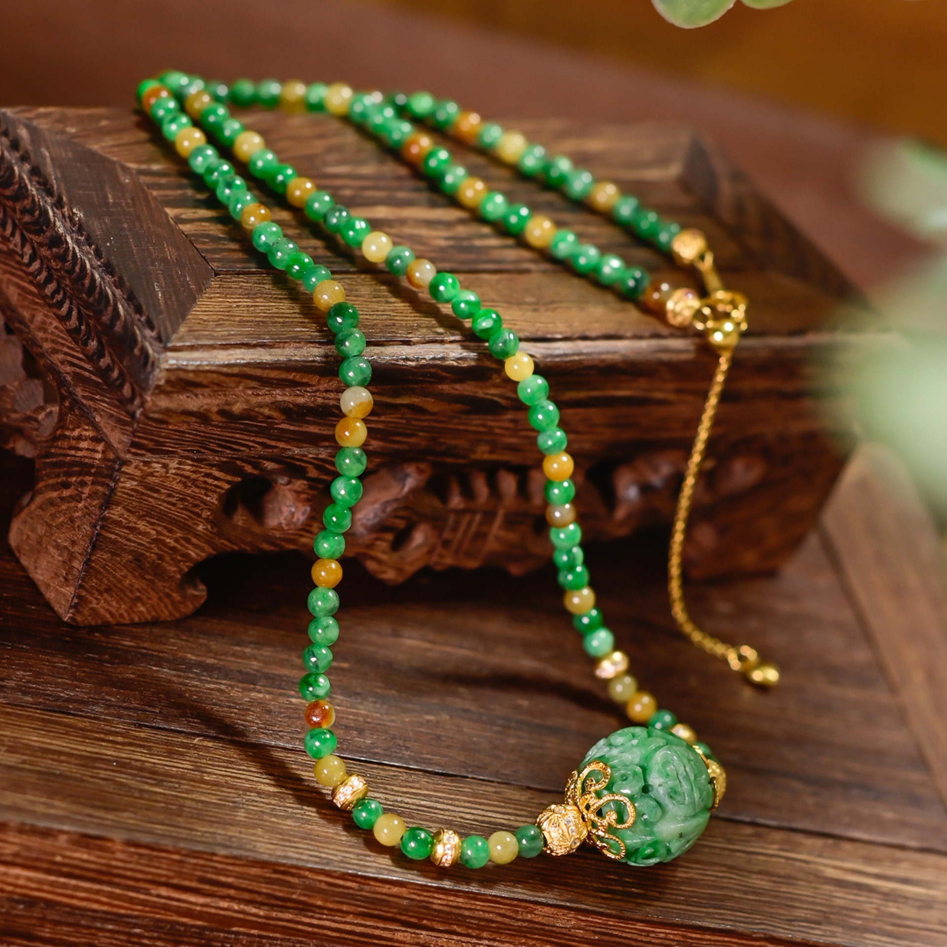 PIPISHOP 天然A货干青翡翠雕花圆珠925银镀金双色翡翠米珠短项链