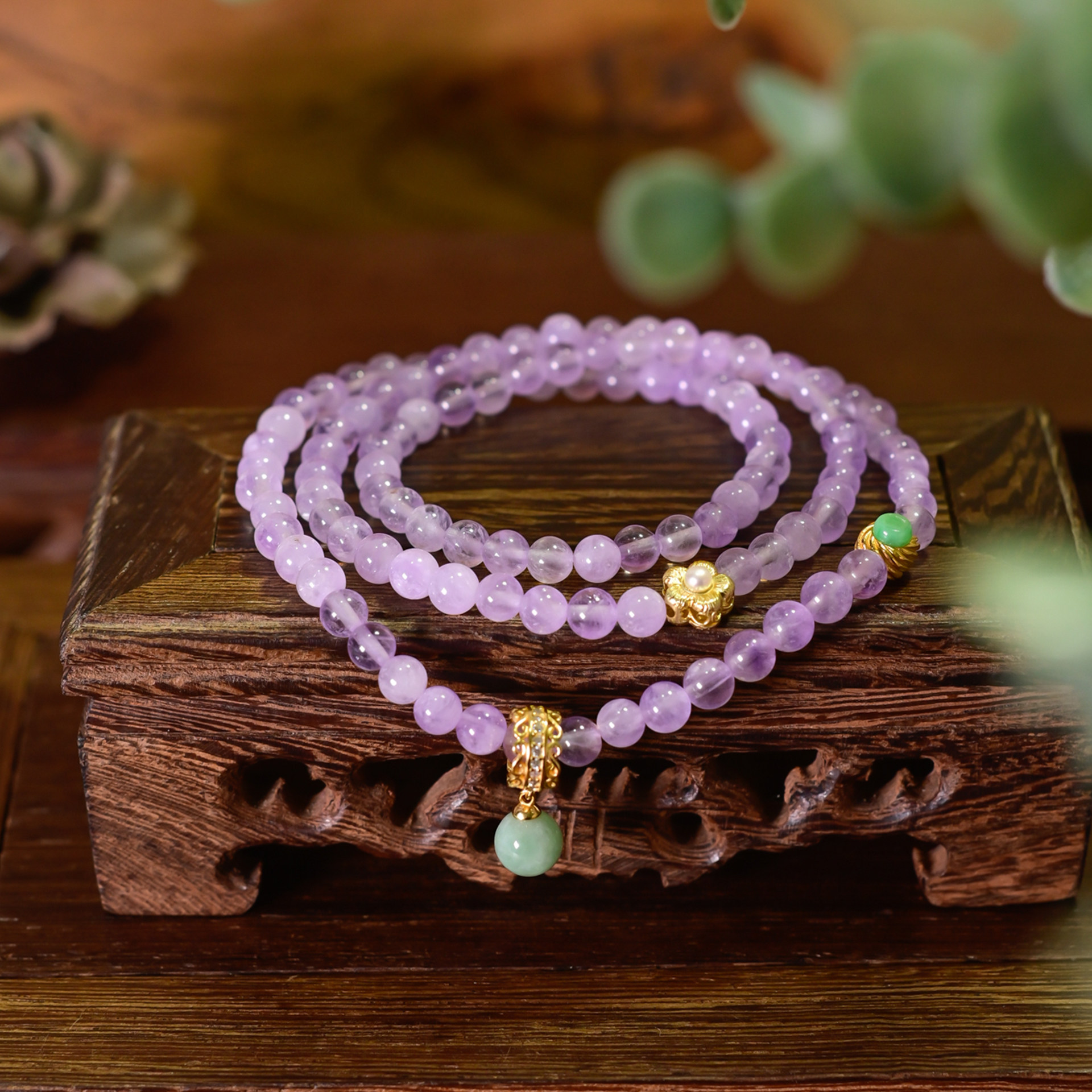 PIPISHOP 天然A货翡翠925银镀金天然紫玉晶圆珠三圈手串
