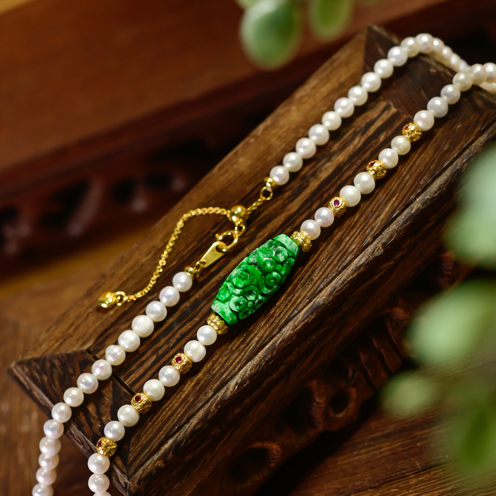 PIPISHOP 925银镀金天然A货干青翡翠雕花橄榄珠淡水珍珠短项链