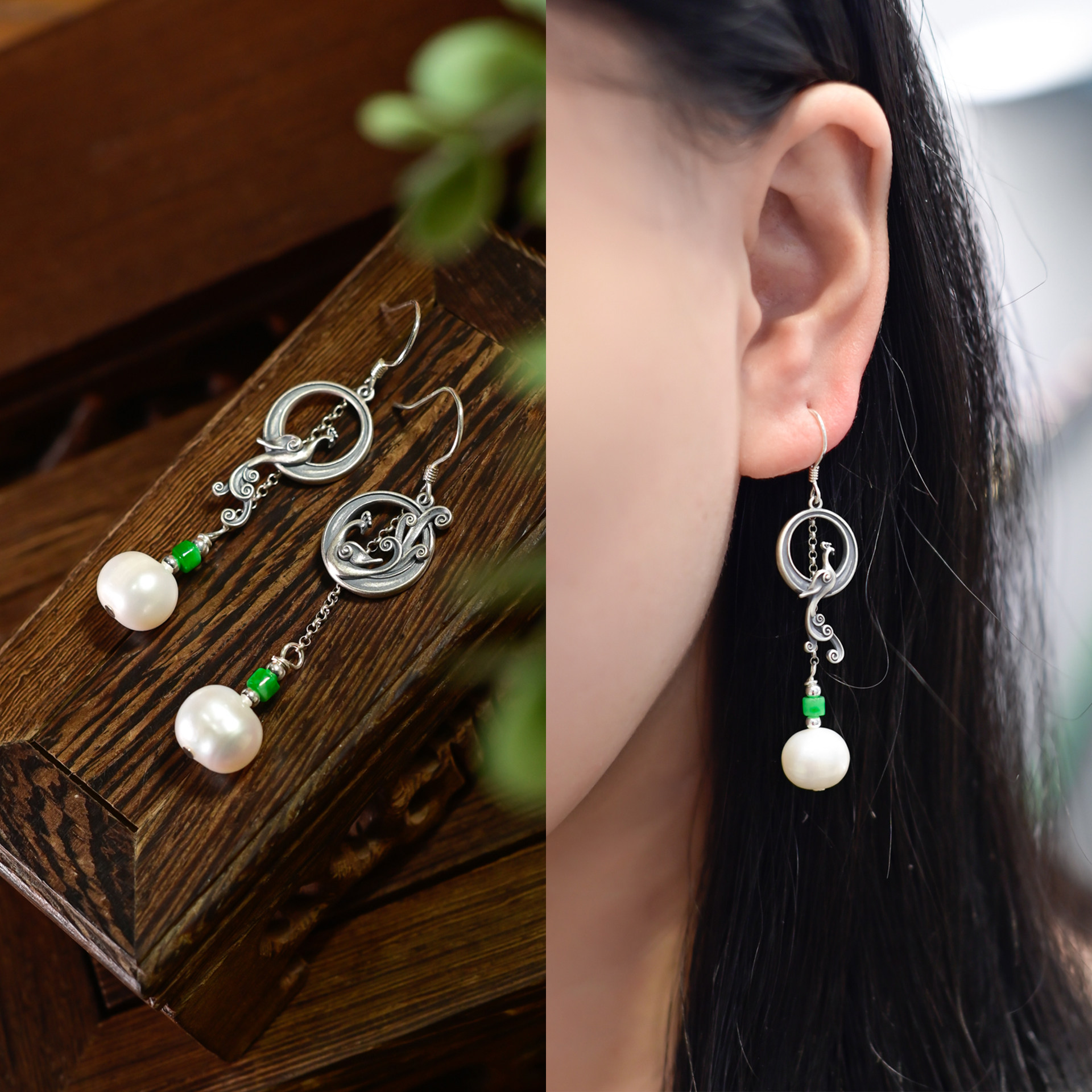 PIPISHOP 天然A货翡翠淡水珍珠925银AB款凤凰长款耳环耳饰