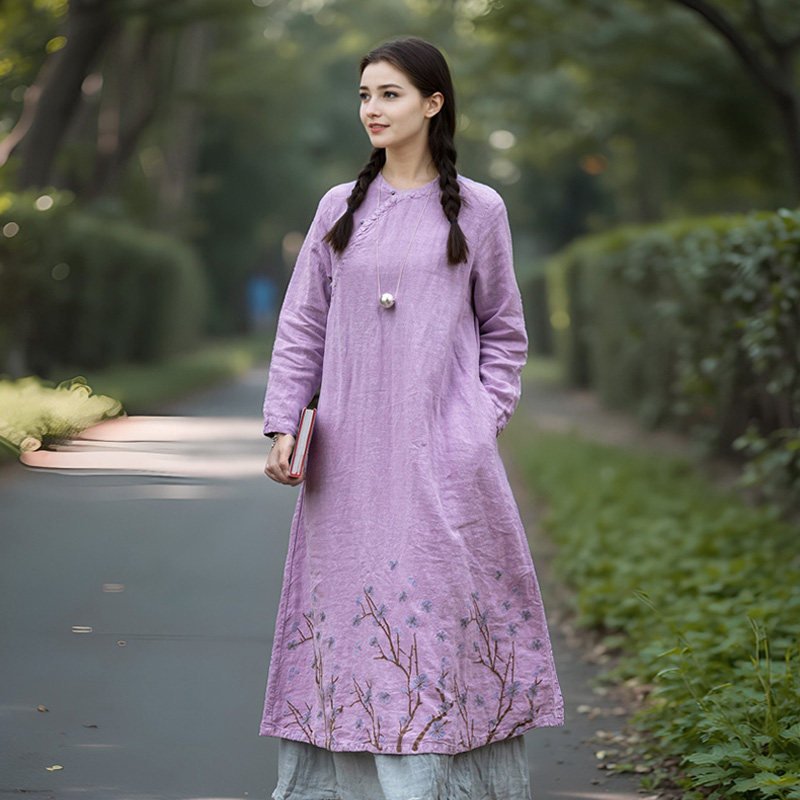 文艺复古长裙中式立领盘扣连衣裙长袖秋款加厚外套袍子棉麻女冬款