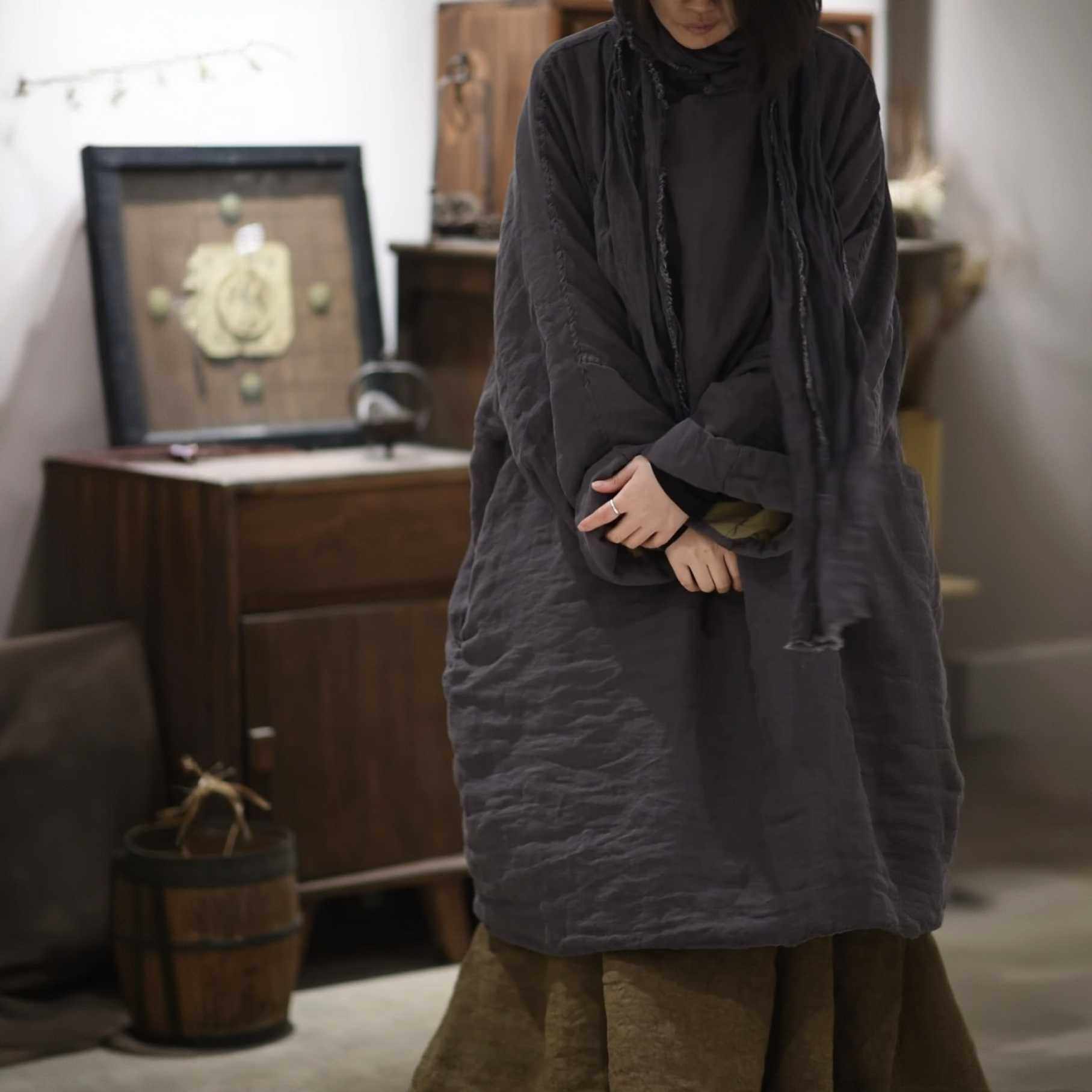 子曰原创复古偏襟盘扣砂洗亚麻棉袍文艺风宽松棉衣夹棉保暖连衣裙