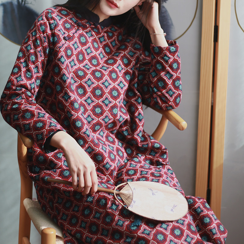冬季夹薄棉连衣裙复古几何花朵撞色立领袍子文艺盘扣宽松改良旗袍