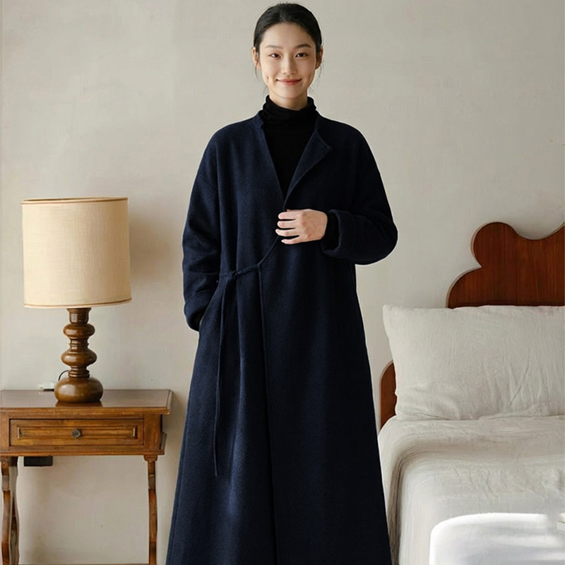 中国风藏蓝色羊毛冬季系带文艺连衣裙大衣 复古斜襟盘扣毛呢外套