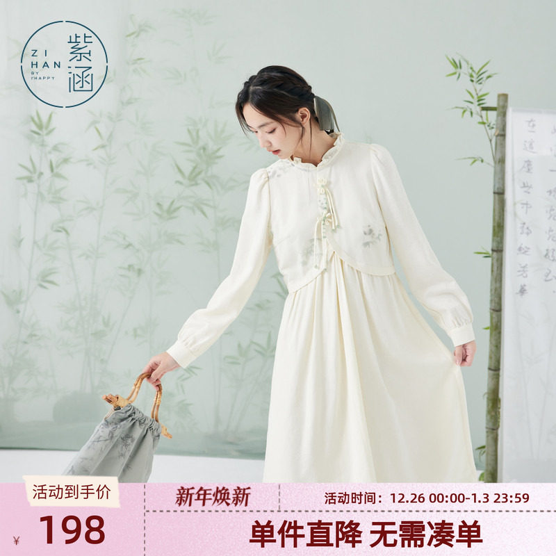 紫涵新中式米白色盘扣连衣裙女春秋季新款文艺禅意中长款A字裙子