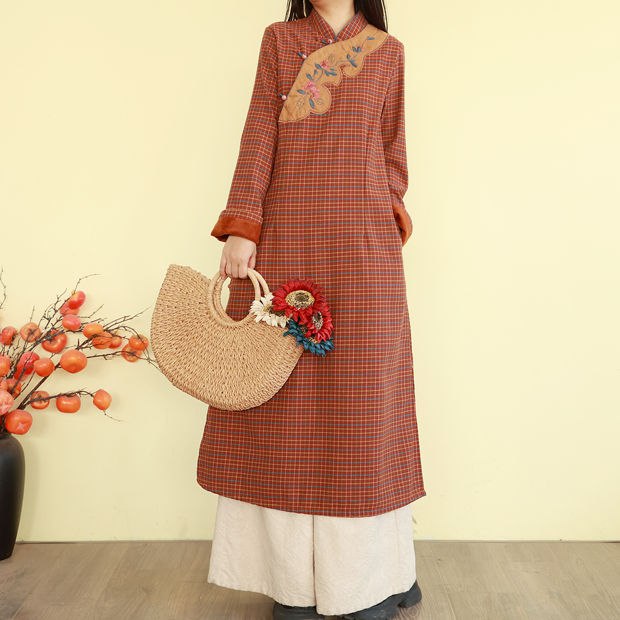 文艺格子长袖连衣裙女加绒冬季盘扣改良旗袍裙刺绣贴布长款气质裙