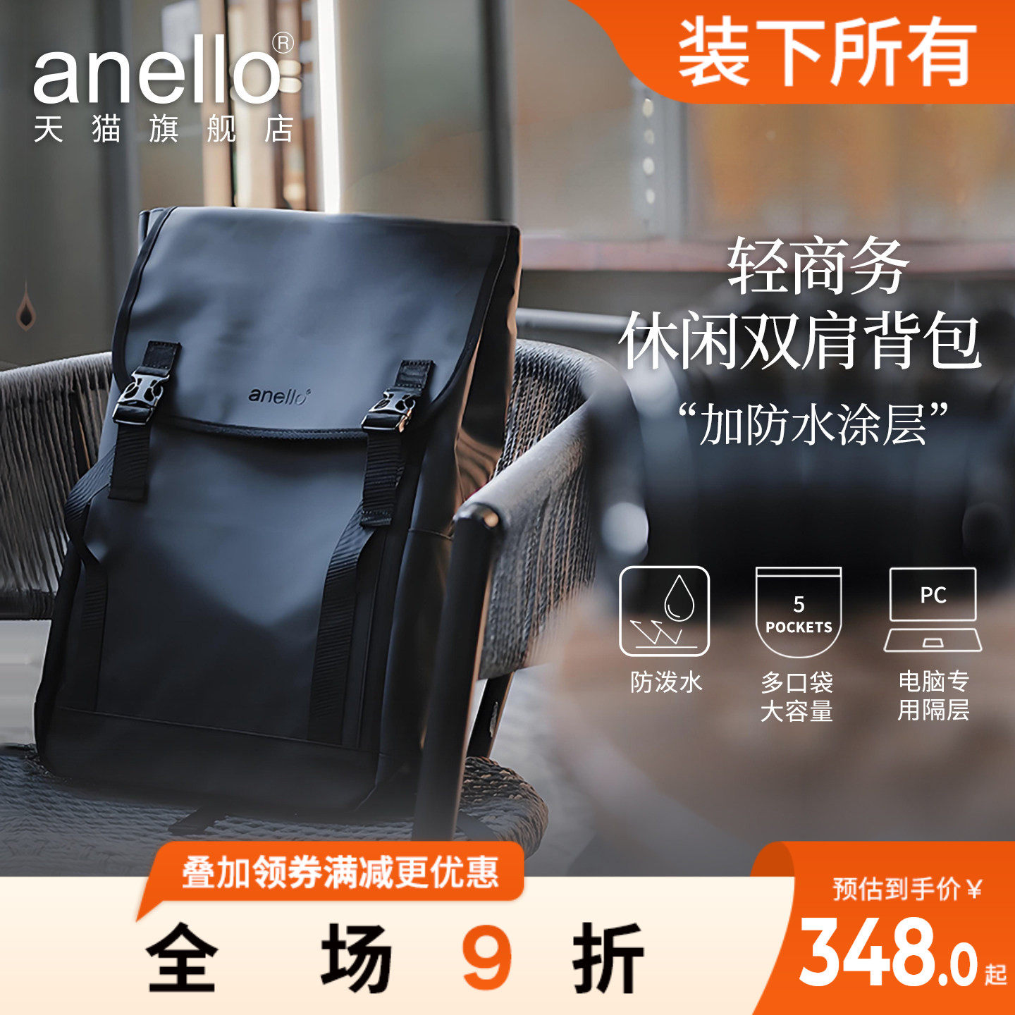 anello旗舰店日本双肩包办公男女背包书包防泼水可容17寸电脑隔层