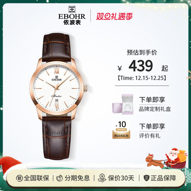 依波表EBOHR手表礼物女简约情侣石英表百搭真皮表带男士手表5186