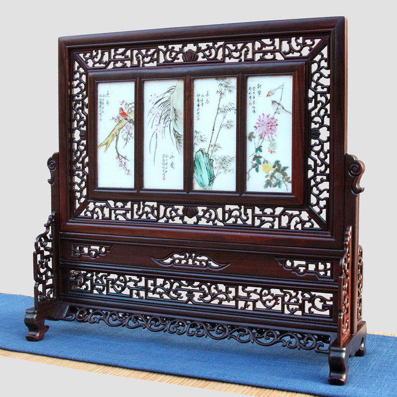 实木红木屏风插屏老挝大红酸枝嵌瓷片台屏中式客厅家居工艺品摆件