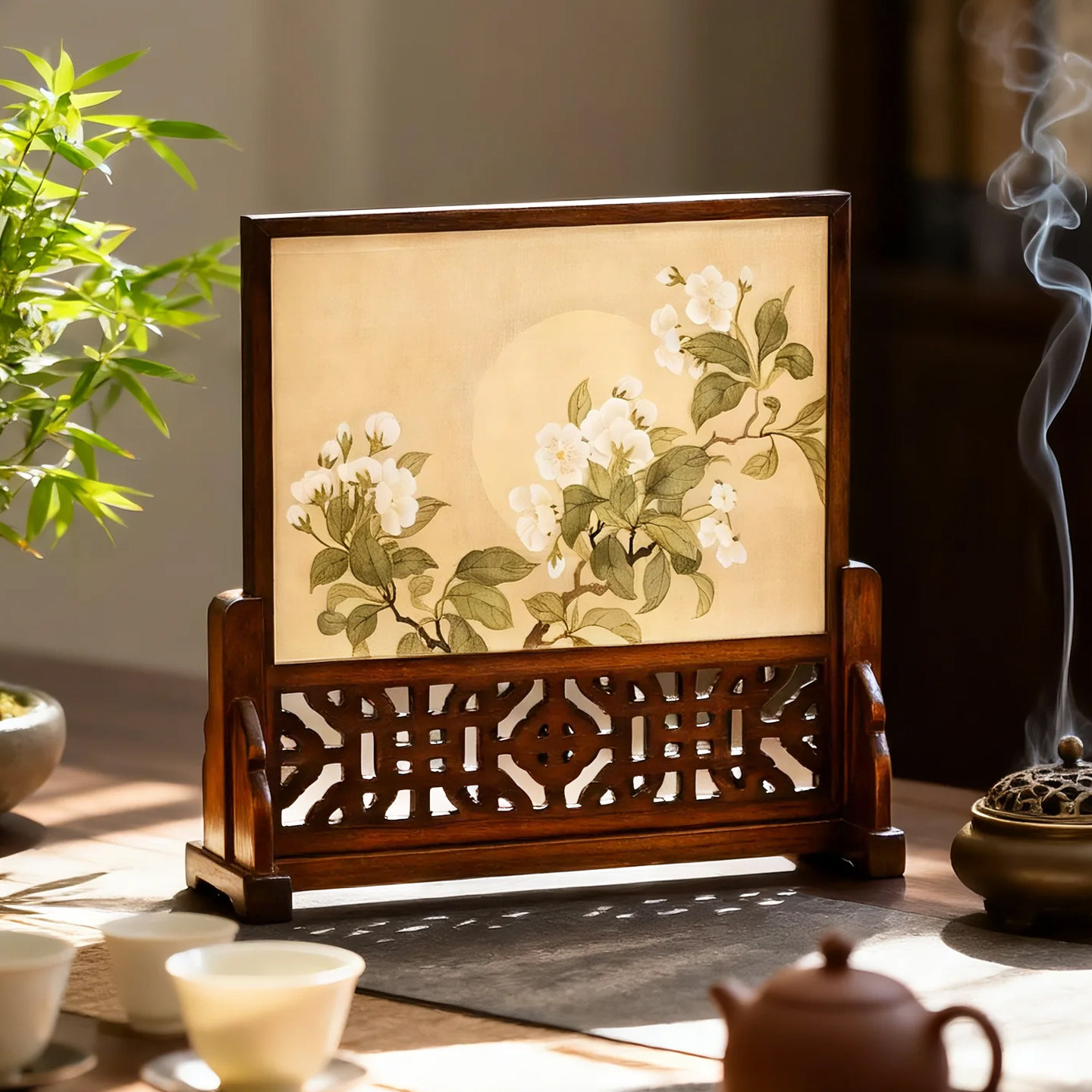 苏绣桌面屏风创意刺绣摆件中国风中式家居红木台屏手工双面绣摆台