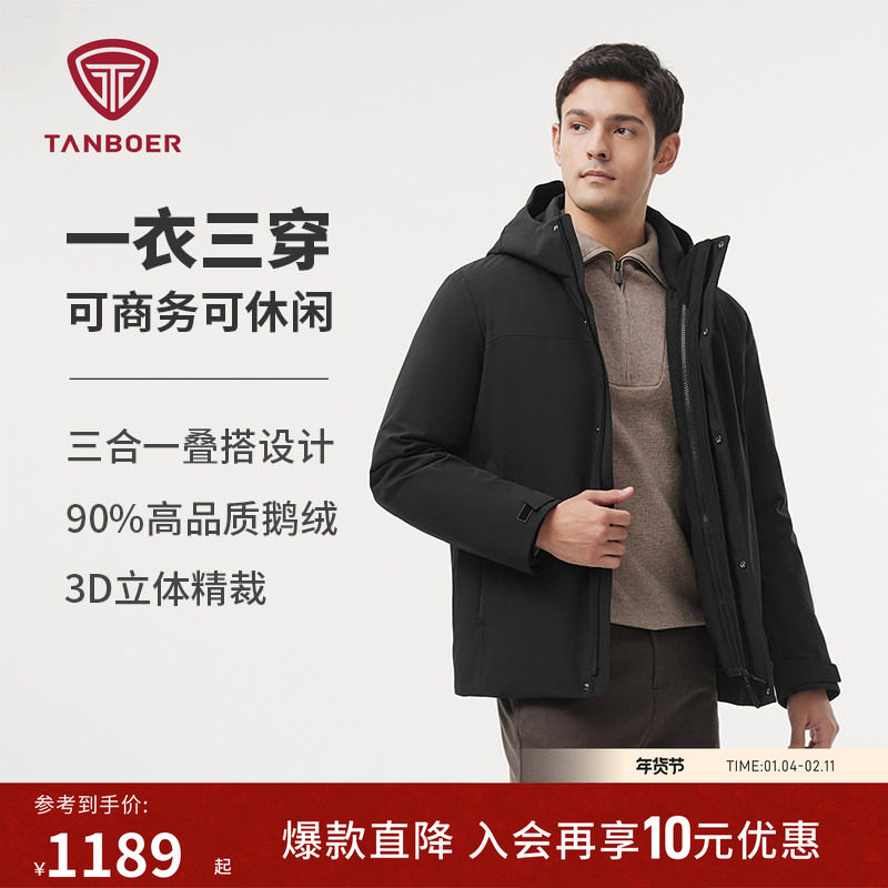 坦博尔冬季羽绒服男士连帽90%鹅绒短款保暖加厚品质休闲商务外套