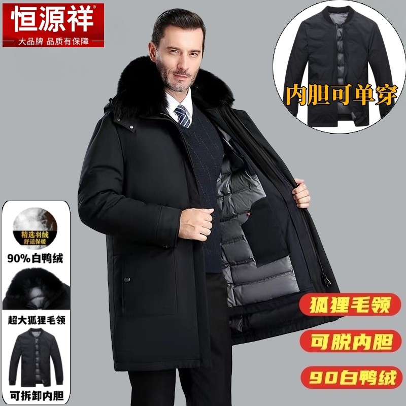 恒源祥羽绒服男士中长款可脱卸内胆中老年白鸭绒加厚保暖爸爸外套