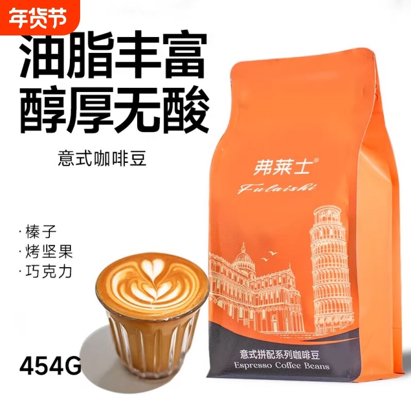 弗莱士意式咖啡豆454g现磨特浓美式拿铁黑咖啡粉深度烘焙手冲拼配