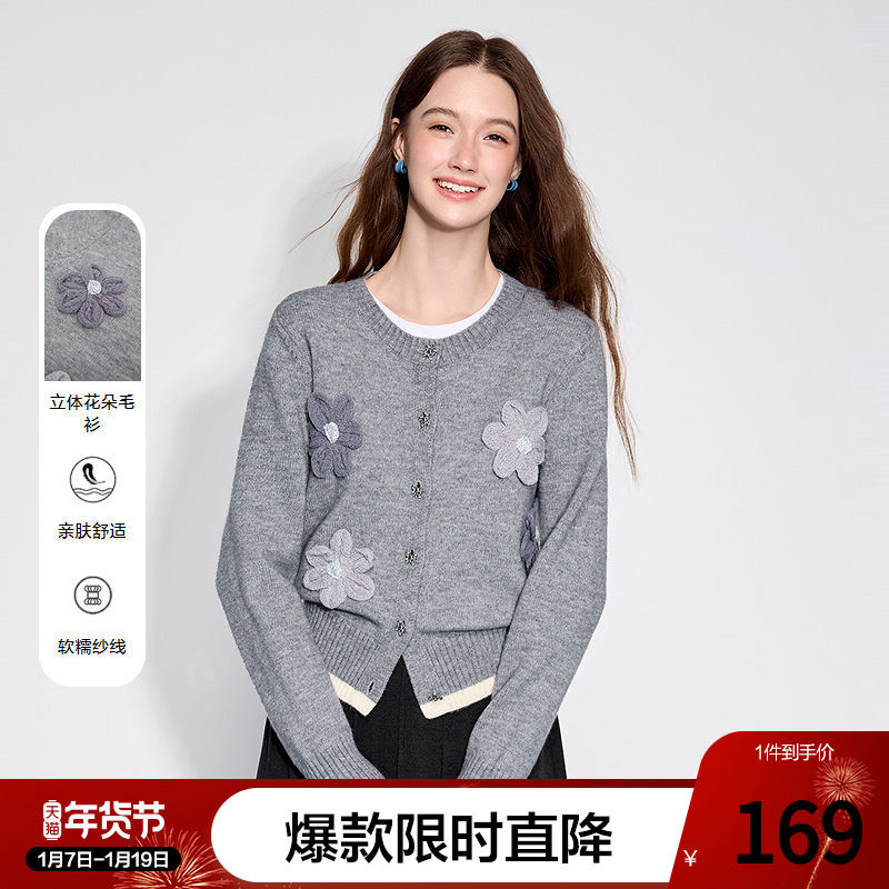 betu百图独特好看手工花朵针织衫女2026年春季新款圆领毛衣开衫