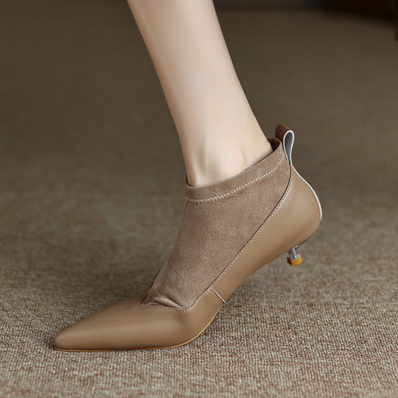 猫跟短靴女春秋单靴性感时尚气质拼接真皮显瘦尖头小跟裸靴及踝靴