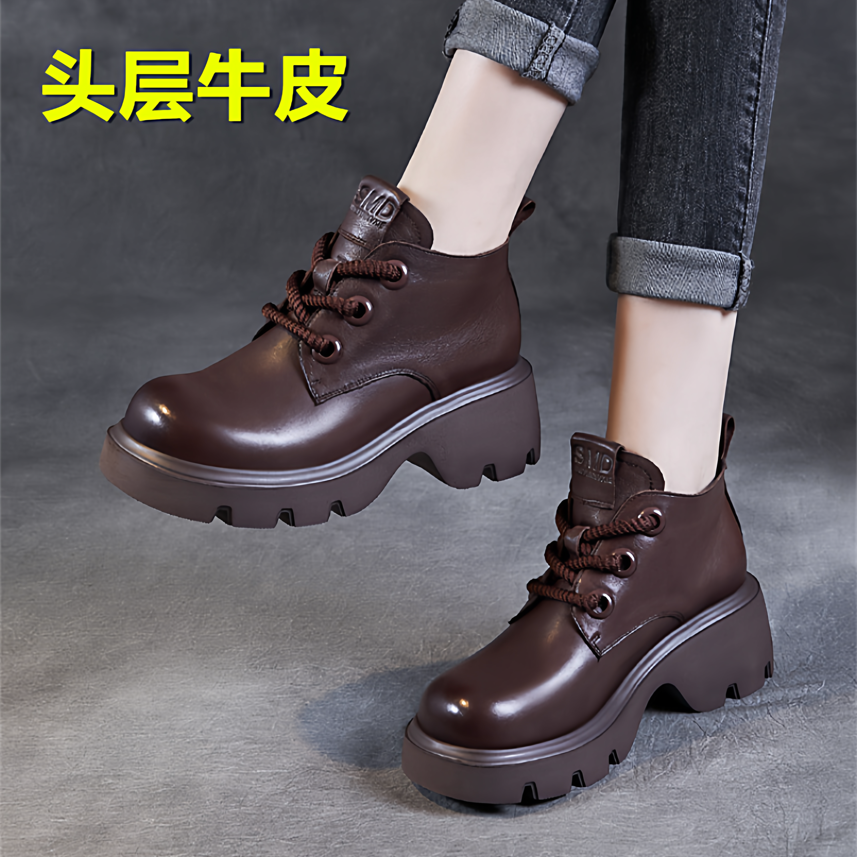 头层牛皮~高端女鞋~真皮高帮春秋厚底时尚短靴英伦复古风及踝靴子
