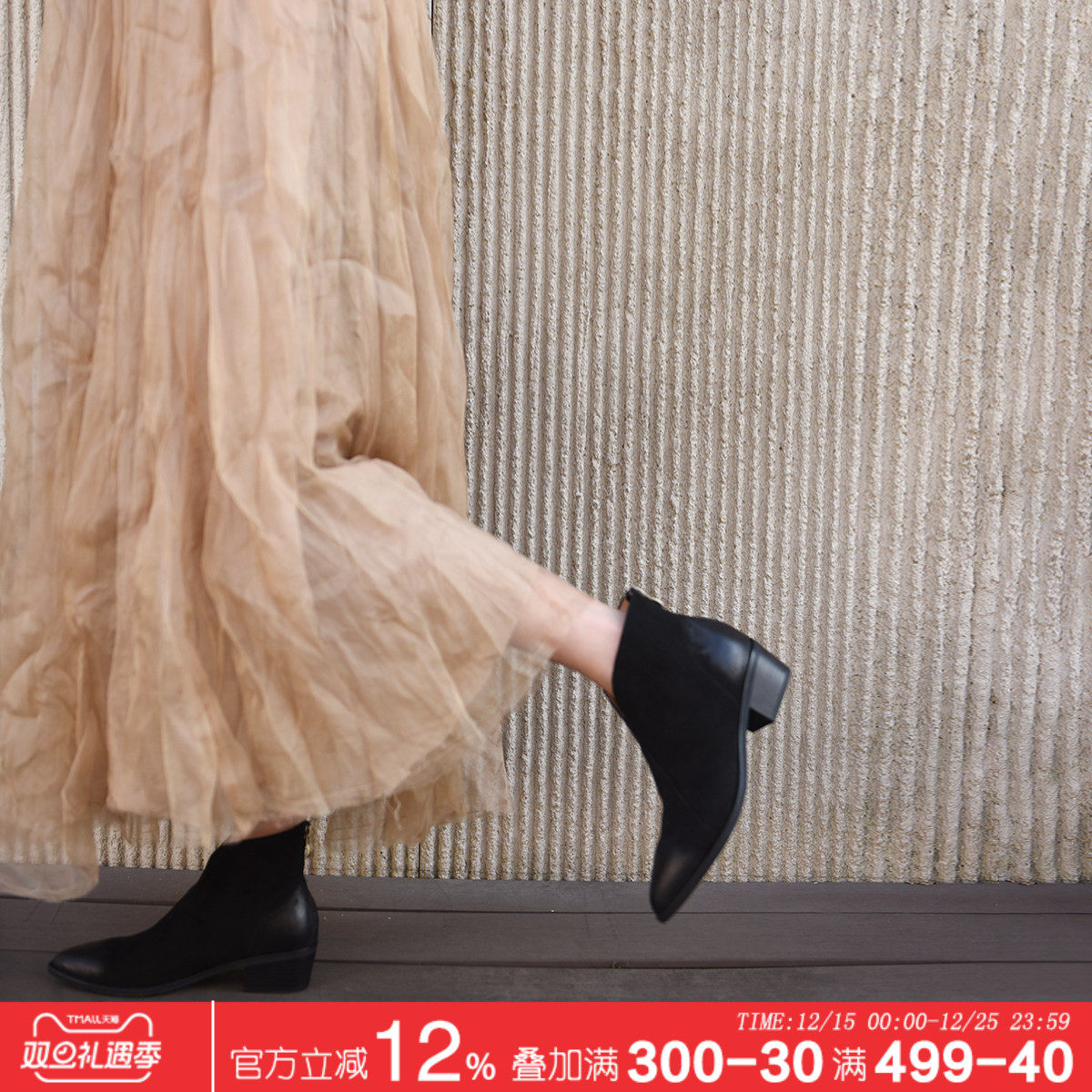 Kmeizu用心做鞋~羊皮4cm粗跟短靴女春秋单靴方头中跟切尔西及踝靴