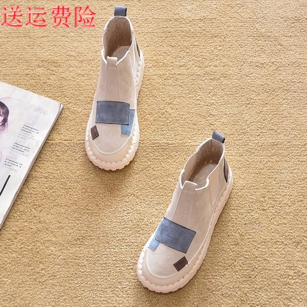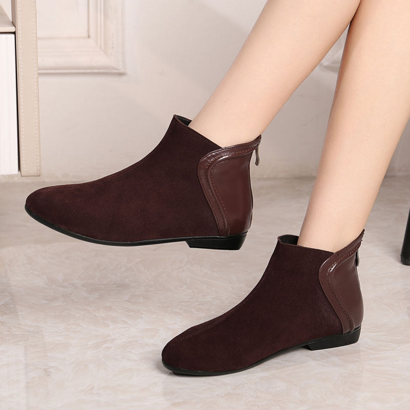 圆头磨砂牛皮平跟短靴软底2022春秋百搭拼色后拉链及踝靴大码女靴