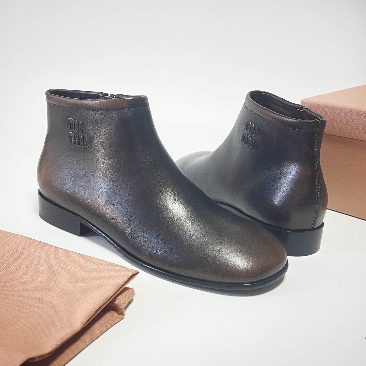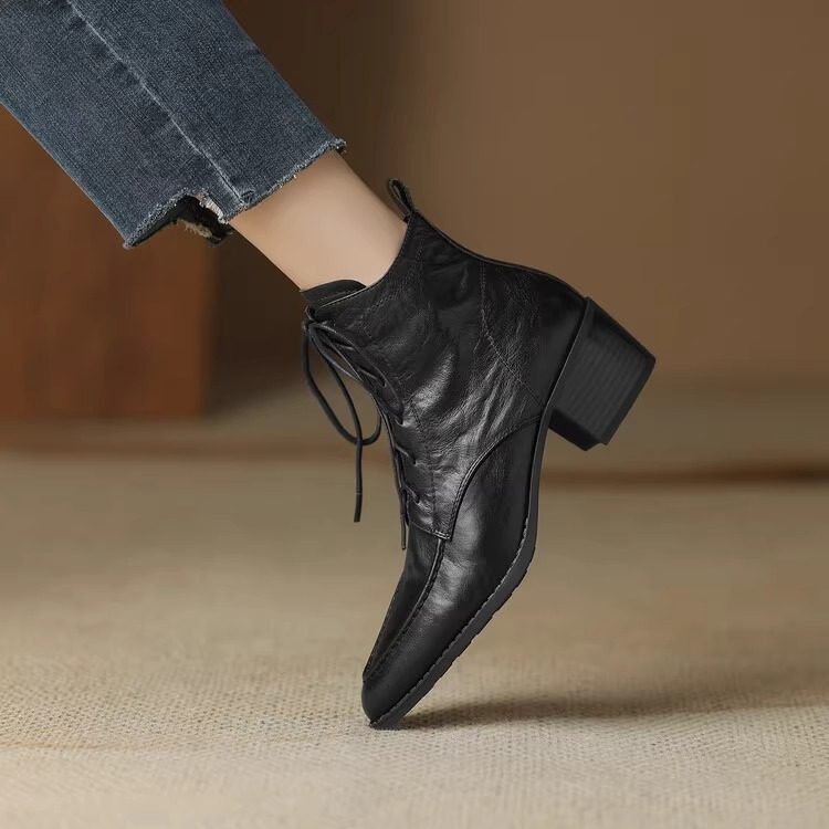 2025新款秋冬女鞋软皮粗跟高跟鞋小短靴及踝靴春秋女士中跟真皮鞋