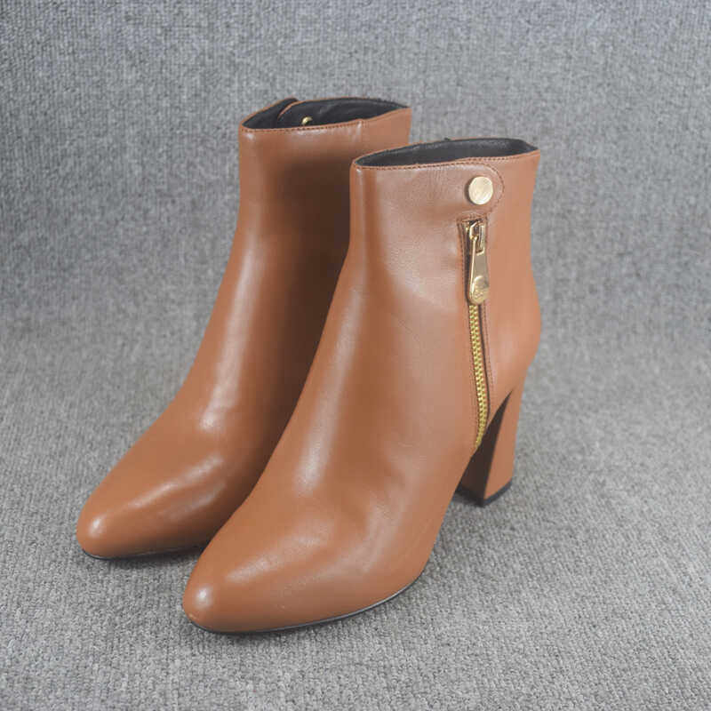 外贸特价春秋粗跟短靴女真皮侧拉链及踝靴圆头高跟时装靴单靴女鞋
