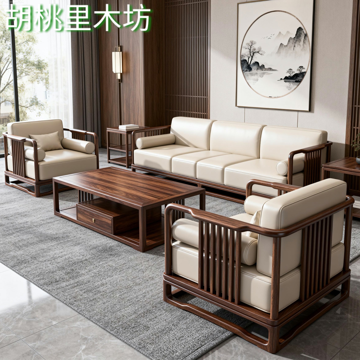 现代简约乌金木真皮沙发新中式家用客厅高档别墅头层牛皮组合家具