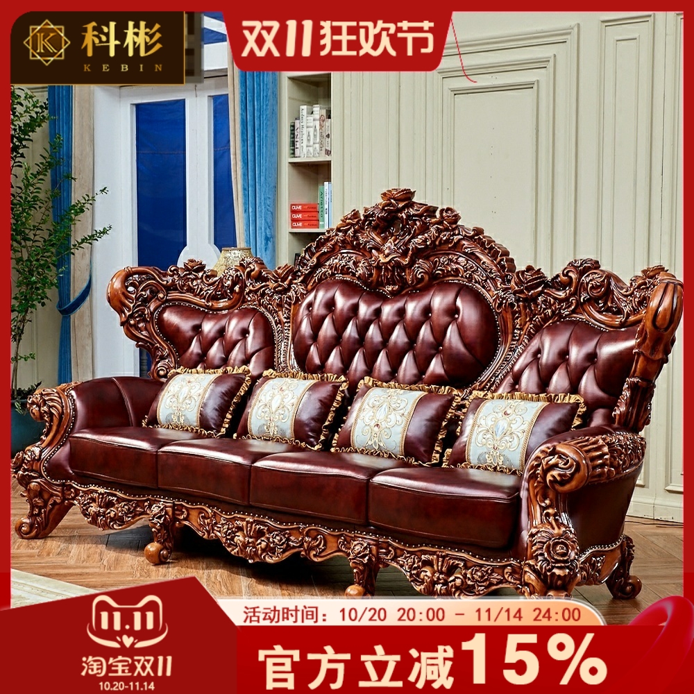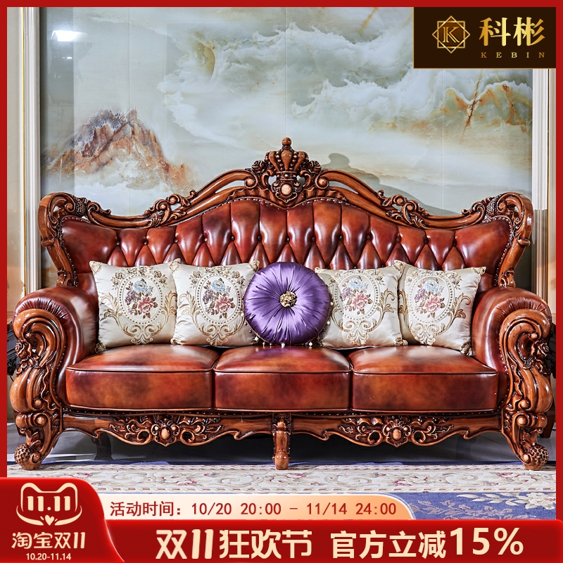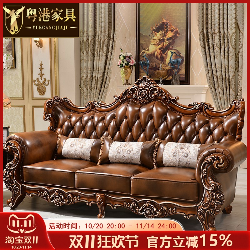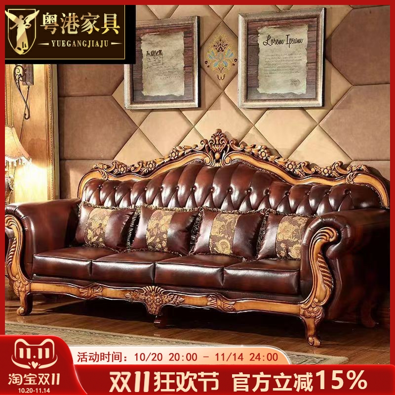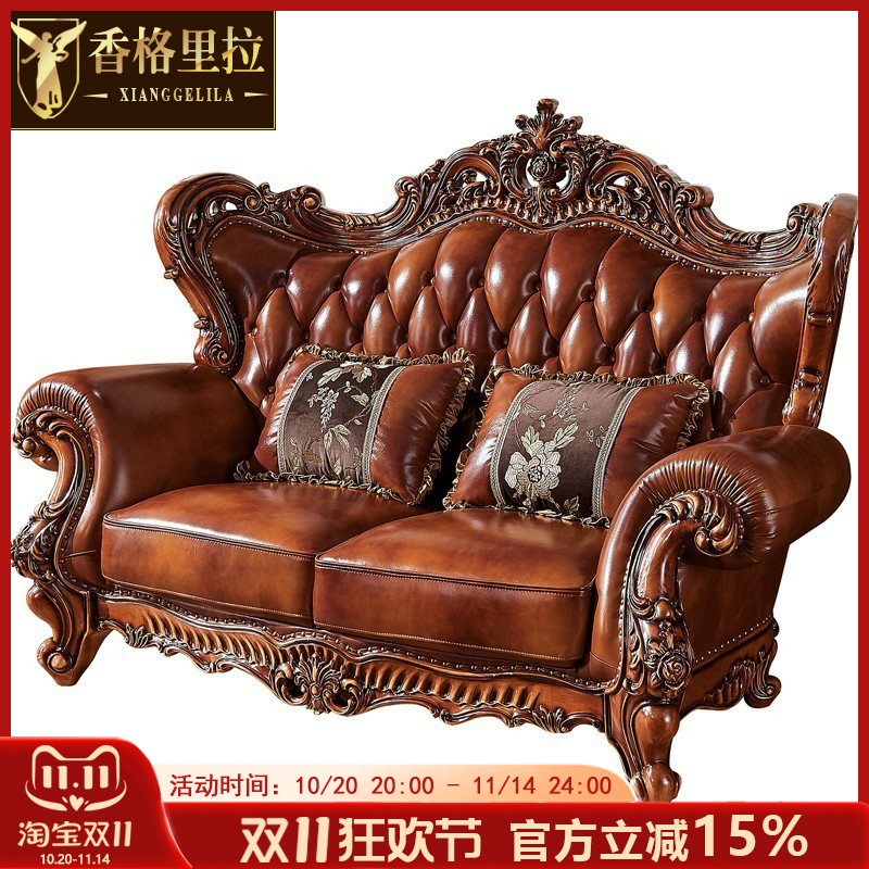 真皮沙发头层牛皮客厅组合三人位实木雕花家用欧式厚皮艺大小户型