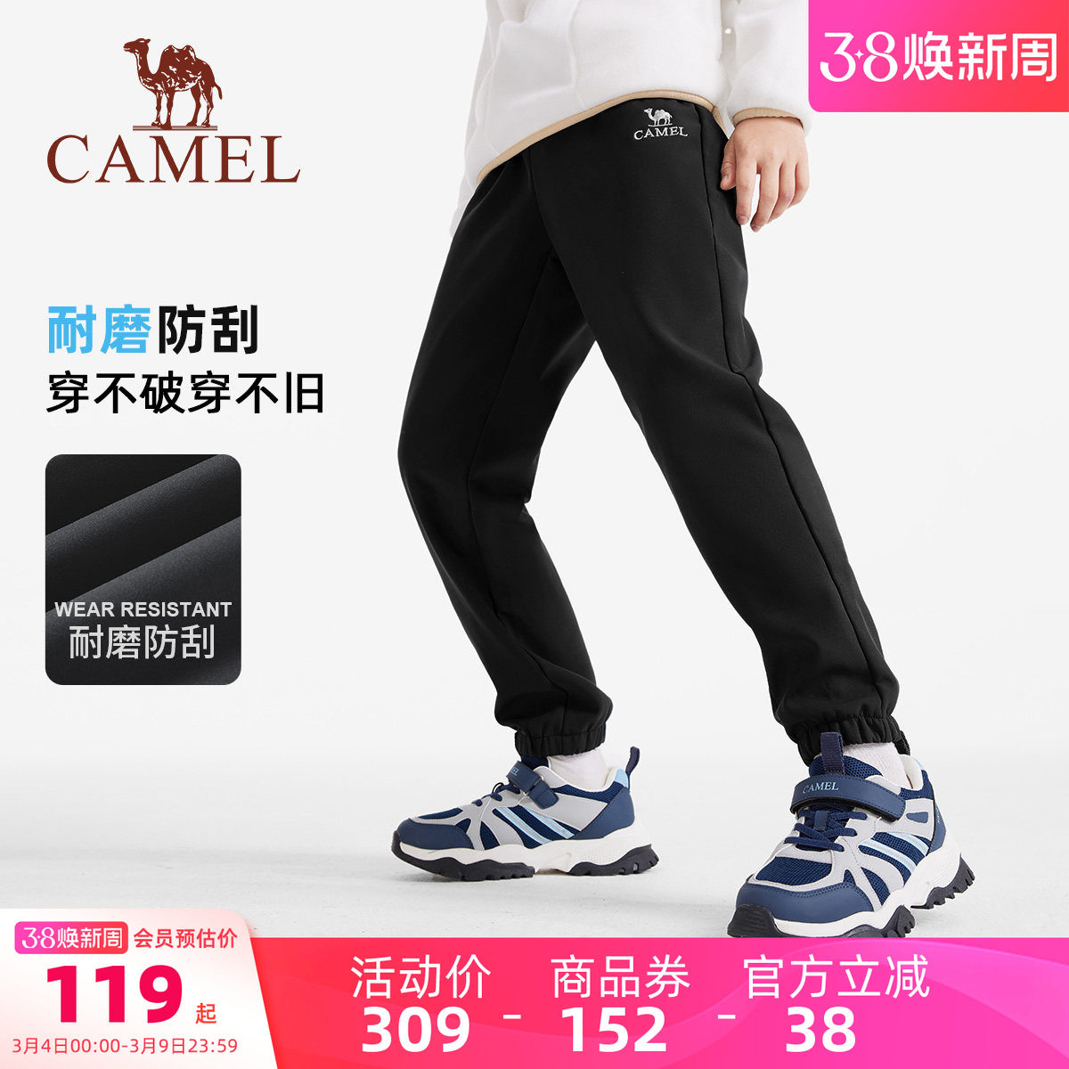 骆驼儿童软壳裤户外冲锋裤男童大童软壳加绒女防风卫裤运动长裤子