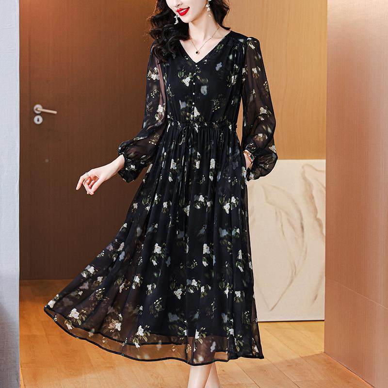 真丝雪纺连衣裙春款高端FTW收腰新气质名媛法气式碎花洋中年长裙
