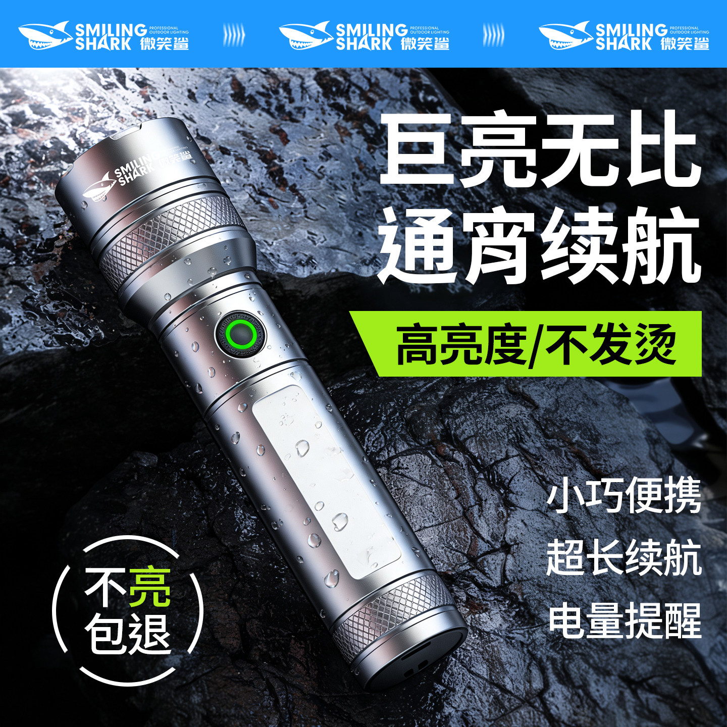 微笑鲨强光小手电筒充电超亮户外远射家用小型便携露营儿童长续航