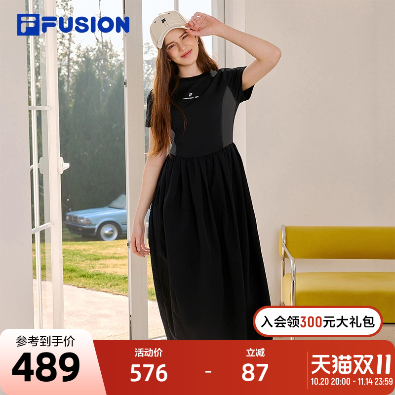 FILA FUSION斐乐潮牌女子连衣裙2025夏新款时尚休闲拼色短袖裙子