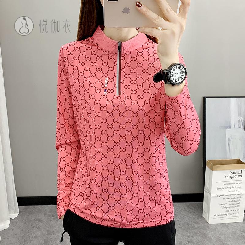 长袖T恤女夏季新款拼色弹力立领上衣户外运动休闲透气大码速干衣