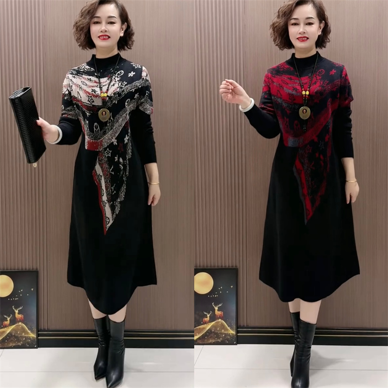 羊毛连衣裙春秋女印花毛衣秋冬气质妈妈大码针织保暖中长款打底衫