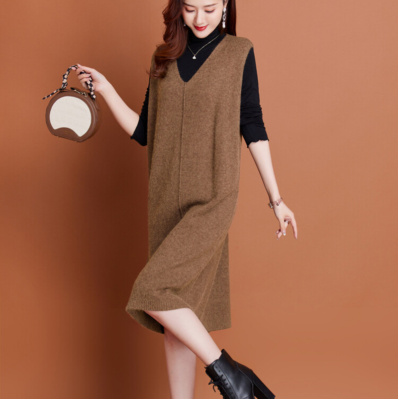 秋冬中长款宽松加大码马甲女羊毛针织过膝无袖毛衣坎肩背心连衣裙