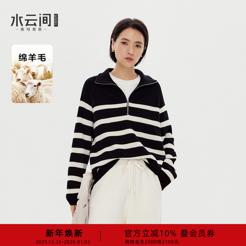 水云间黑白条纹polo领毛衣女羊毛针织衫套头上衣厚叠穿2025冬新款