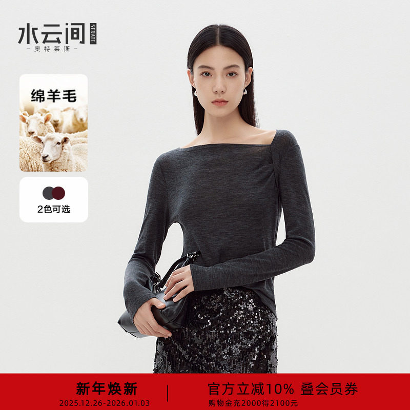 水云间斜肩纯羊毛针织衫上衣女叠穿长袖毛衣内搭打底衫保暖2025秋