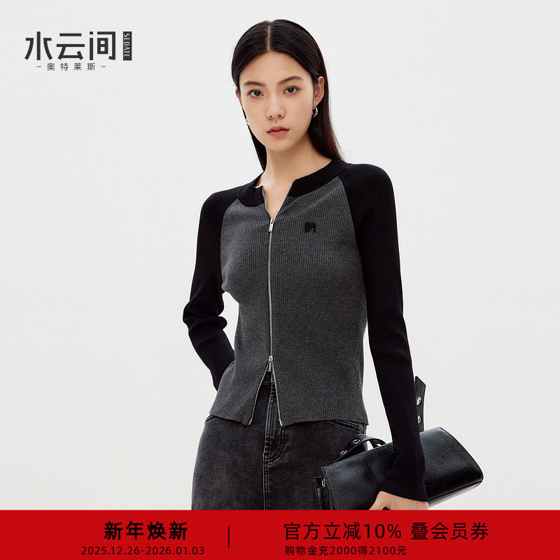 水云间黑色毛针织开衫外套女修身长袖上衣外搭双拉链2025秋季新款