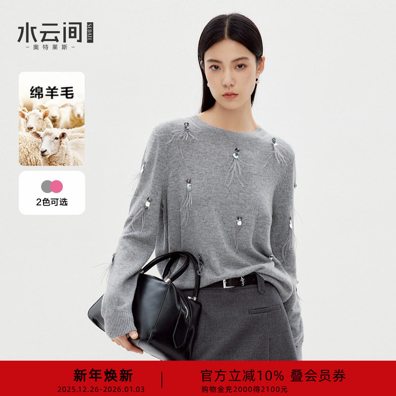 水云间灰色纯羊毛针织衫女亮片钉珠宽松毛衣套头叠穿上衣2025秋冬