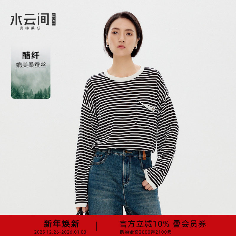 水云间黑白条纹毛针织衫上衣女圆领长袖T恤宽松叠穿2025秋季新款
